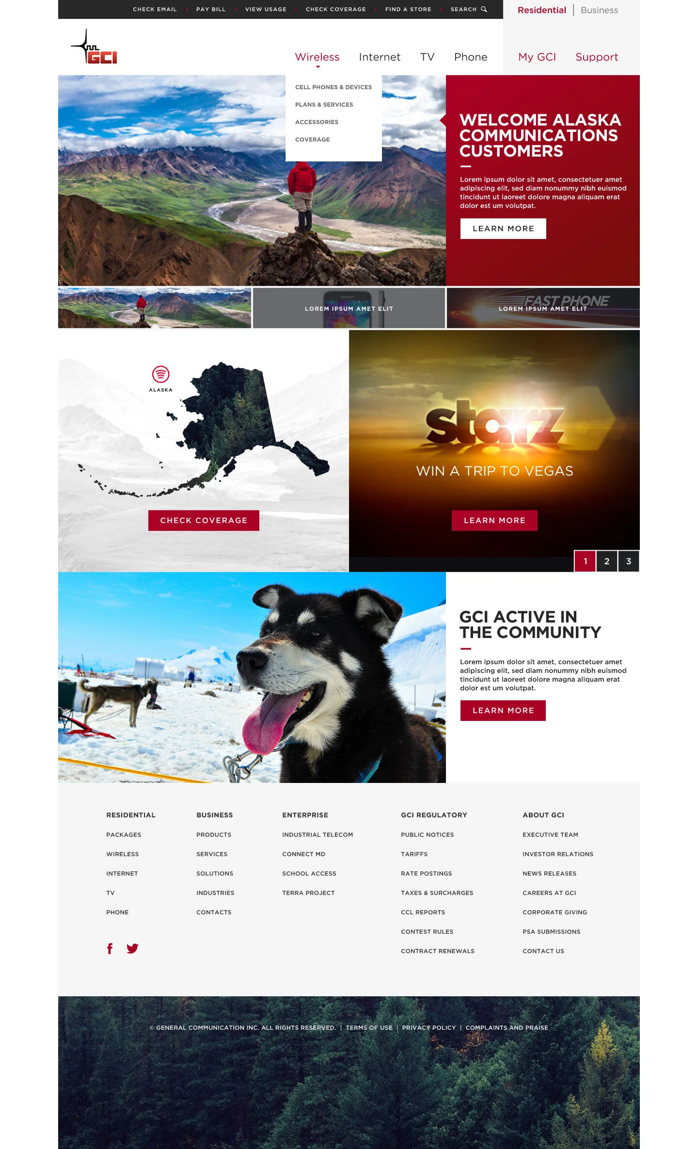 We redesigned the General Communications Inc (GCI) responsive website with the goal of acquiring new customers while retaining their residential and business customer base. Because large telecoms were moving into Alaska and offering more products and coverage our strategy was to assure Alaskans that GCI is “Alaska loyal” and “Alaska proud”. GCI knows the people they serve. Whether people live here, work here, or simply play here, GCI connects them all—and is always here when needed. To support this strategy, we created a GCI community by incorporating user-generated stories content on the site and in social. #alaskabornandreaised